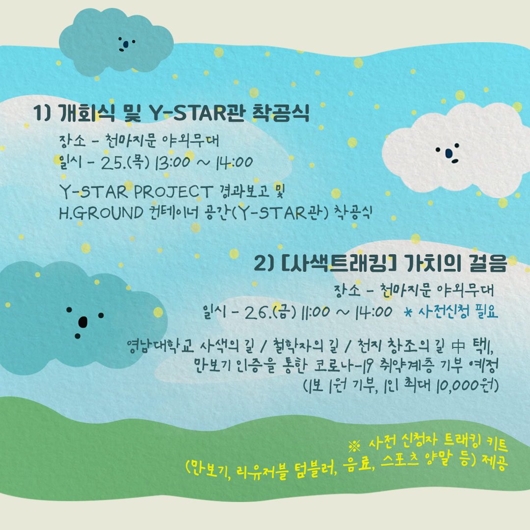 - 영남대학교 사색의 길 / 철학자의 길 / 천지 창조의 길 中 택1, 만보기 인증을 통한 코로나-19 취약계층 기부 예정