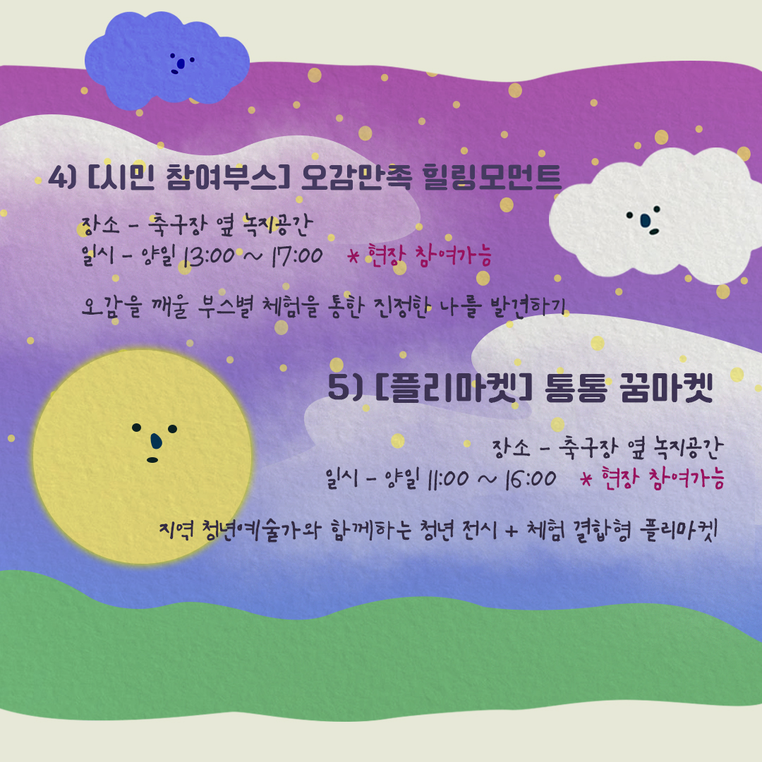 4) [시민 참여부스] 오감만족 힐링모먼트 / 축구장 옆 녹지공간 / 양일 13:00 ~ 17:00