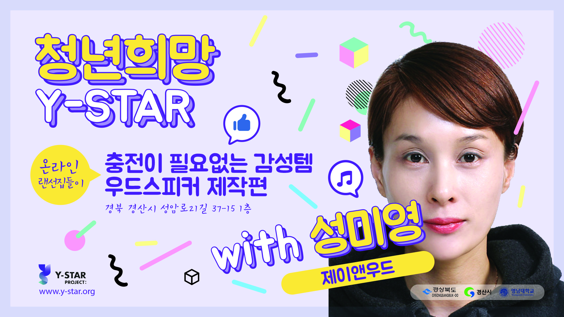 이번 클래스를 통해서 지루했던 공간을 감성으로 가득채울 예쁘고 효과 좋은 우드스피커로 채울 수 있으시면 좋겠습니다! 경상북도, 경산시와 함께 청년희망 Y-STAR 사업단에서는 청년들의 창의적인 활동을 위한 공간을 마련하고 지역사회를 위한 상호협력체계를 구축하기 위하여 노력하고 있습니다.