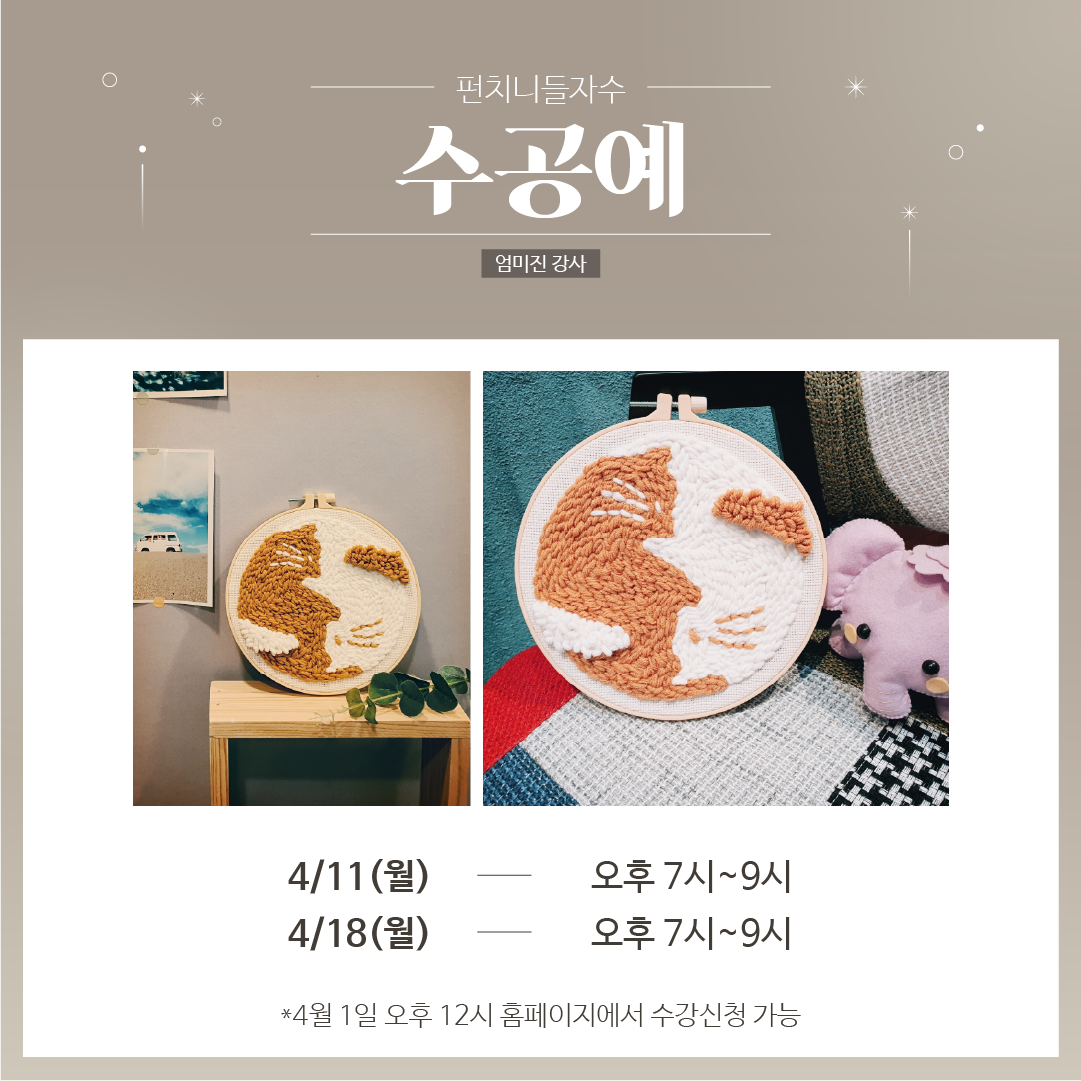 • 제목 [모집마감] [원데이클래스] 4/18(월) 오후 7시 펀치니들자수 만들기