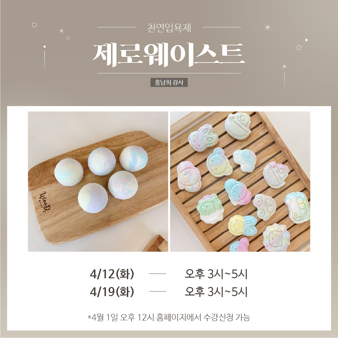 • 제목 [모집마감] [원데이클래스] 4/12(화) 오후 3시 천연입욕제 만들기