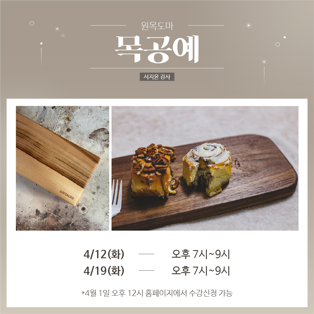 • 제목 [모집마감] [원데이클래스] 4/12(화) 오후 7시 원목도마 만들기