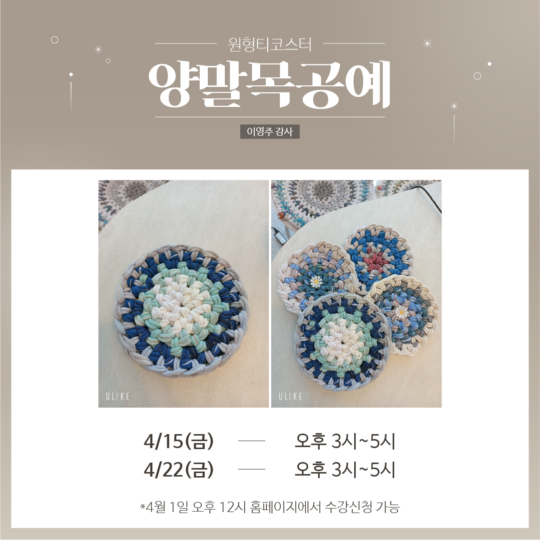 • 제목 [모집마감] [원데이클래스] 4/22(금) 오후 3시 원형티코스터 만들기