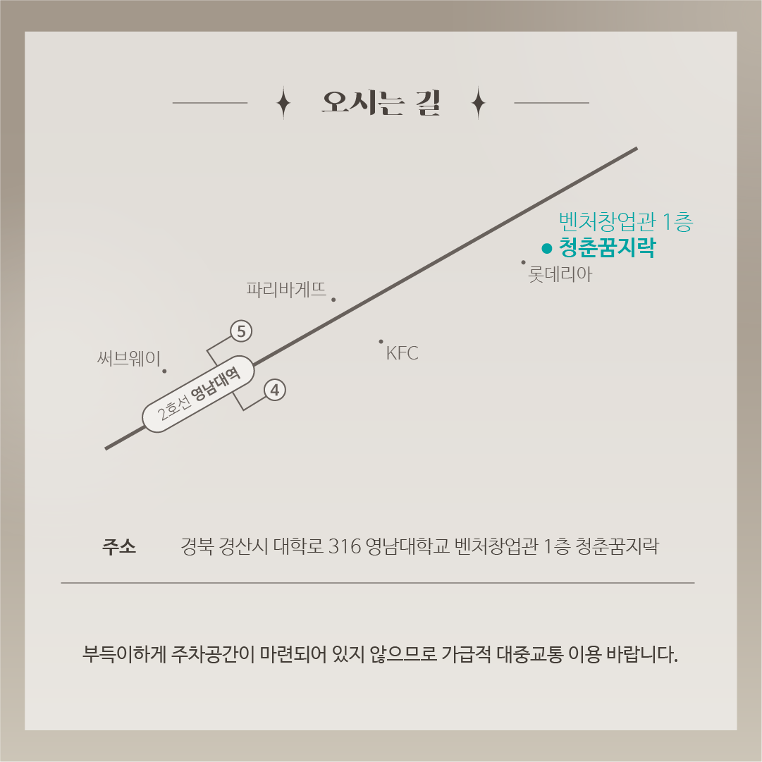 • 장소영남대학교 벤처창업관 1층 청춘꿈지락