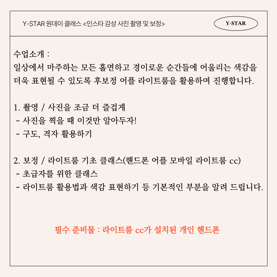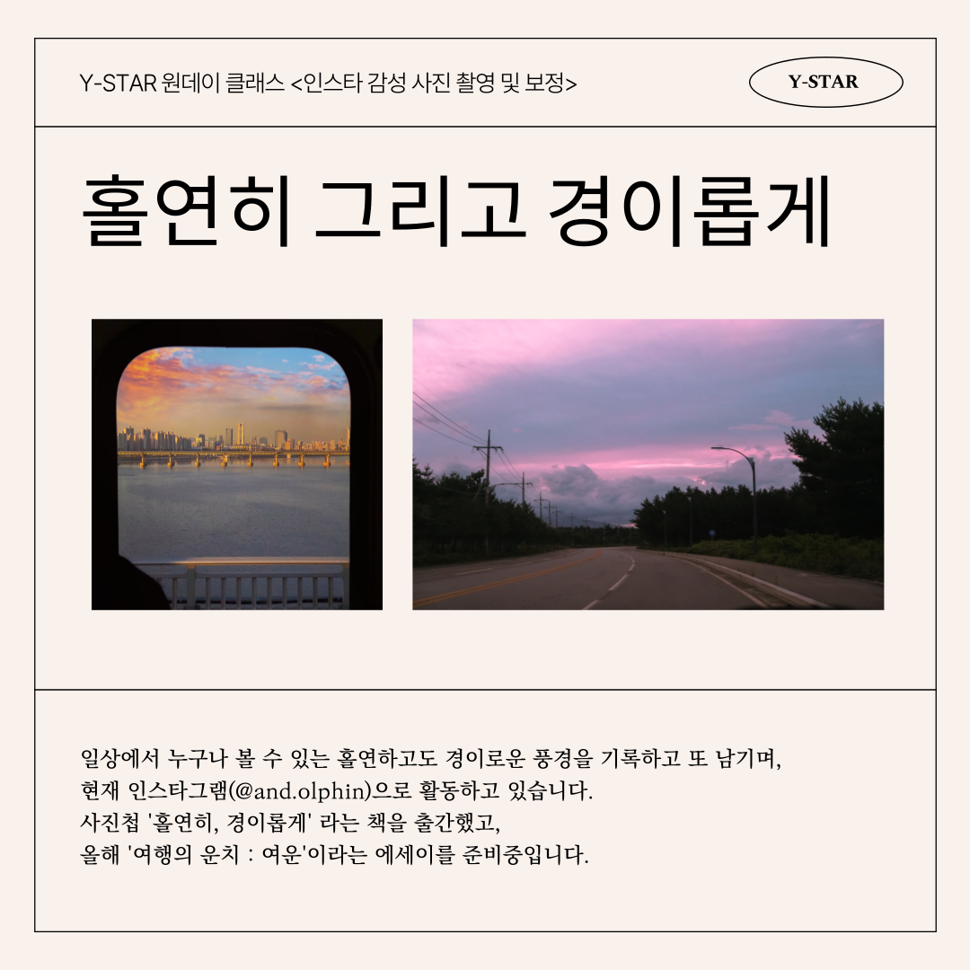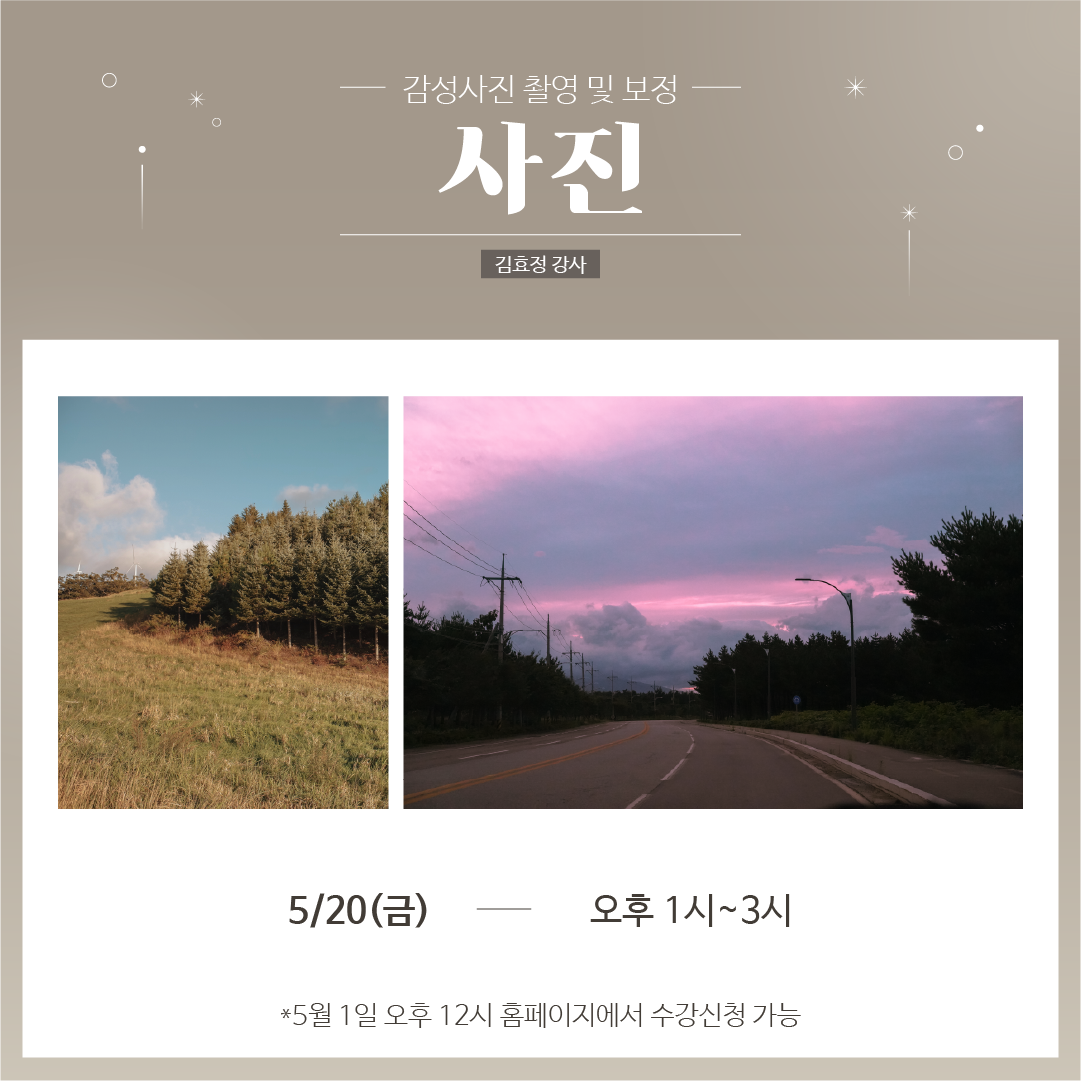 • 제목 [모집마감] [원데이클래스] 5/20(금) 오후 1시 감성사진 촬영 및 보정