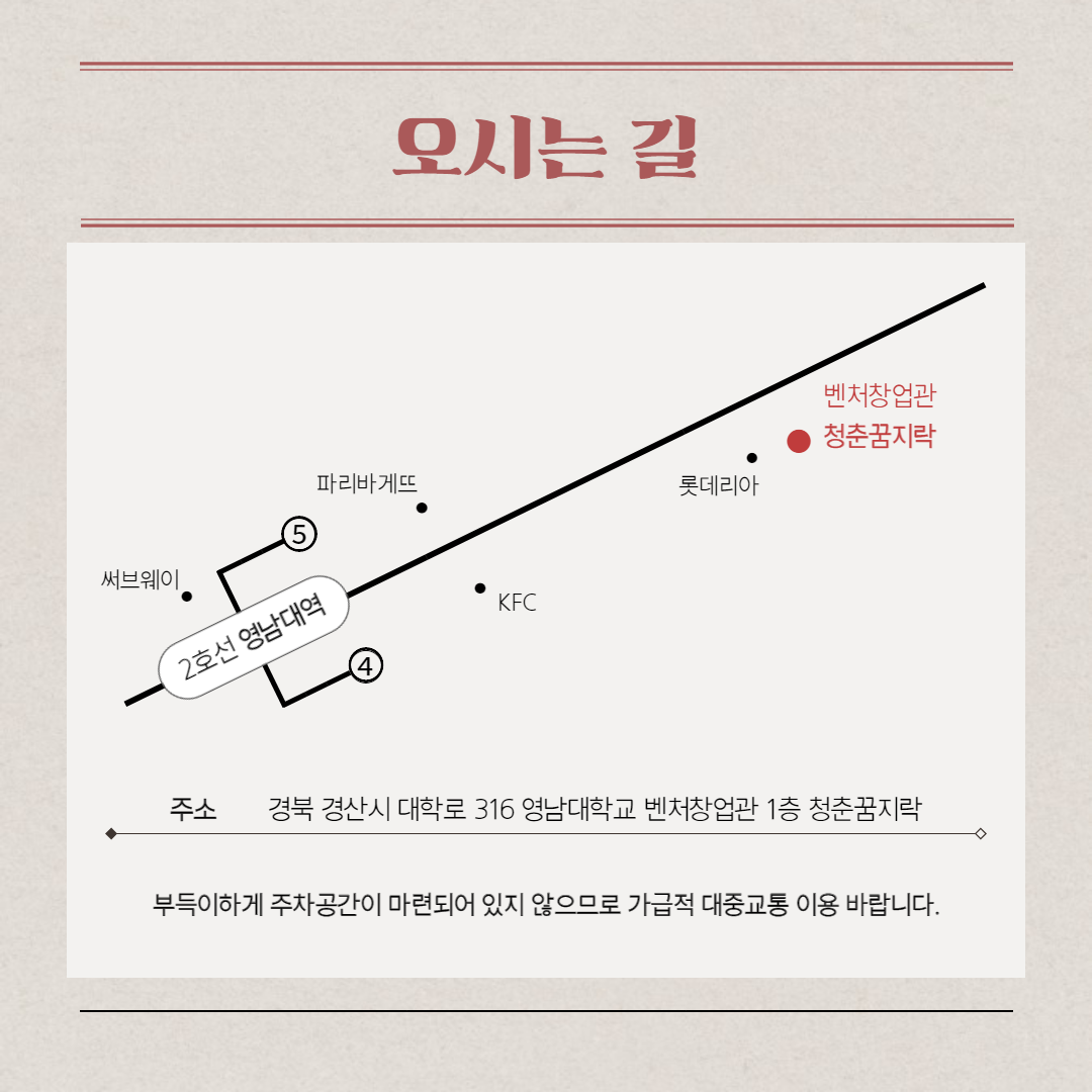 • 장소영남대학교 벤처창업관 1층 청춘꿈지락