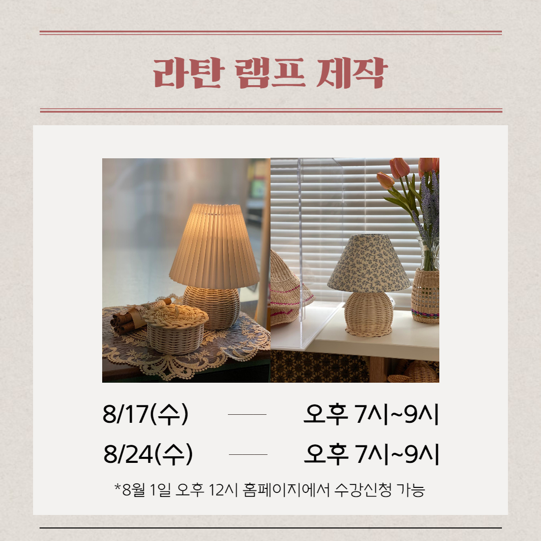 • 제목 [모집마감] [원데이클래스] 8/24(수) 오후 7시 라탄 램프 제작