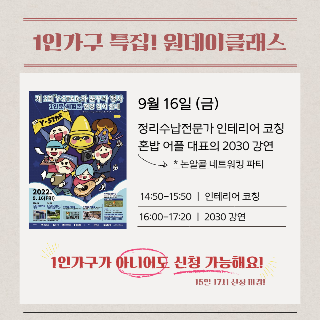 • 제목 [모집마감] [원데이클래스] 9/16(금) 오후 4시 스타트업 혼밥 어플 대표가 말하는 2030세대