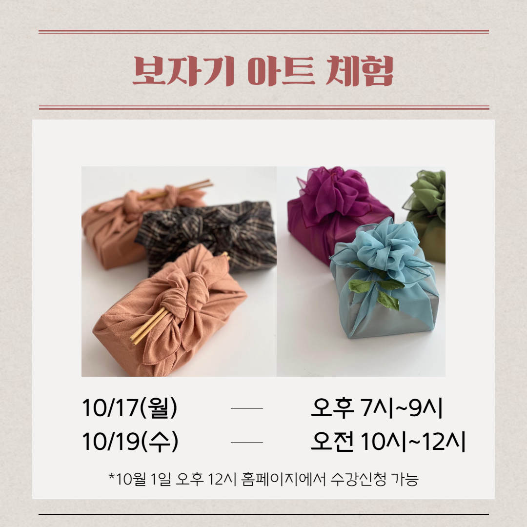 • 제목 [모집마감] [원데이클래스] 10/17(월) 오후 7시 보자기 아트 체험