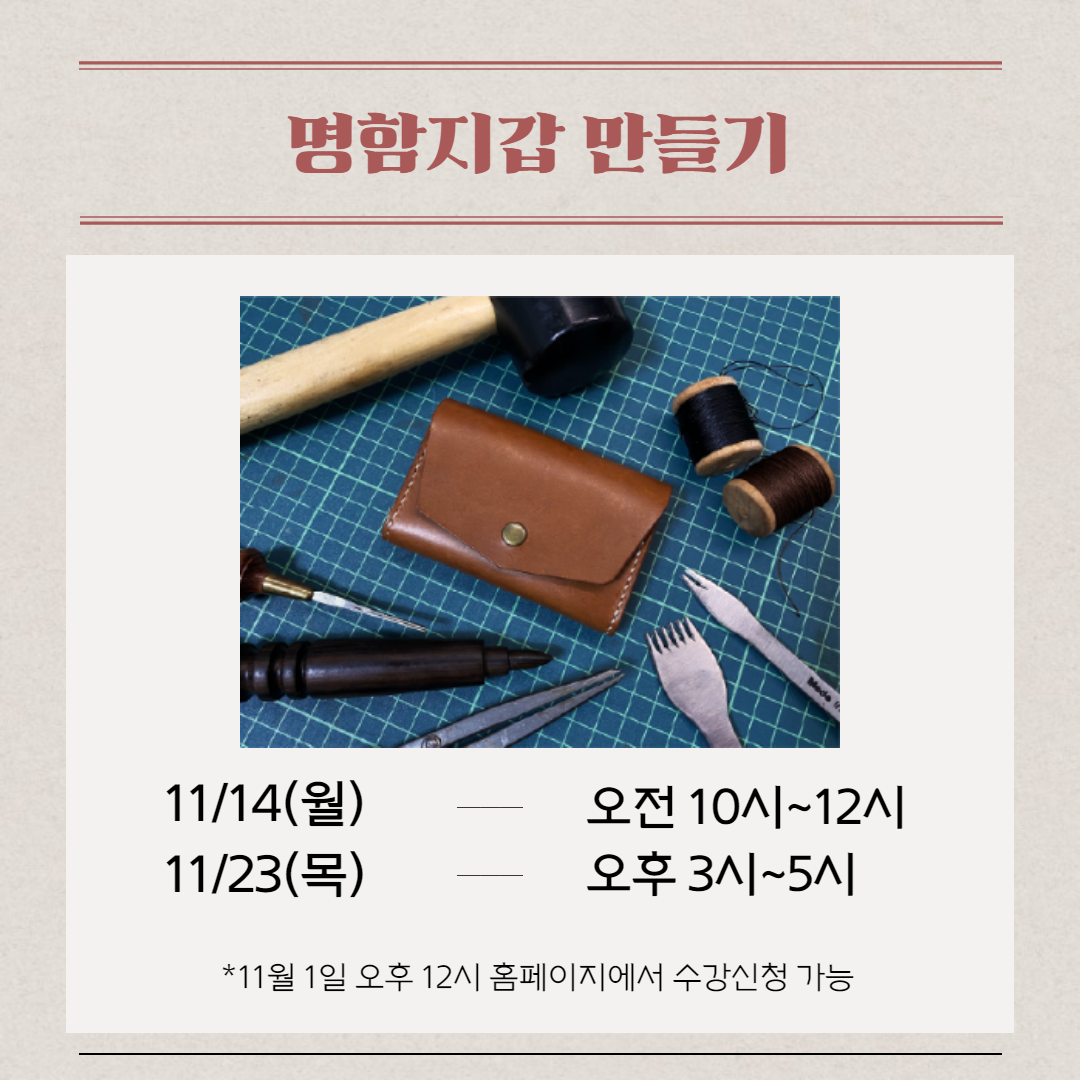 • 제목 [모집마감] [원데이클래스] 11/23(수) 오후 3시 명함지갑 만들기