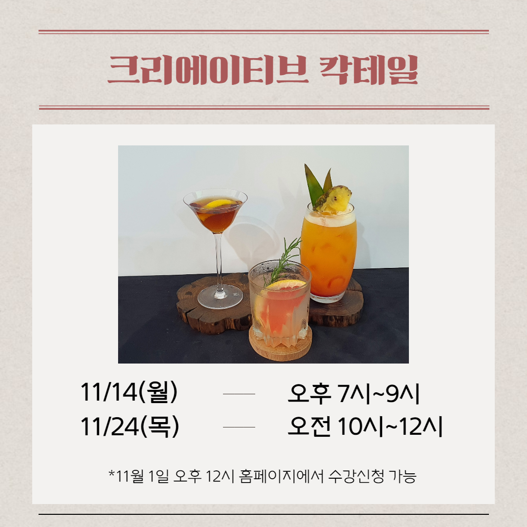 • 제목 [모집마감] [원데이클래스] 11/24(목) 오전 10시 크리에이티브 칵테일