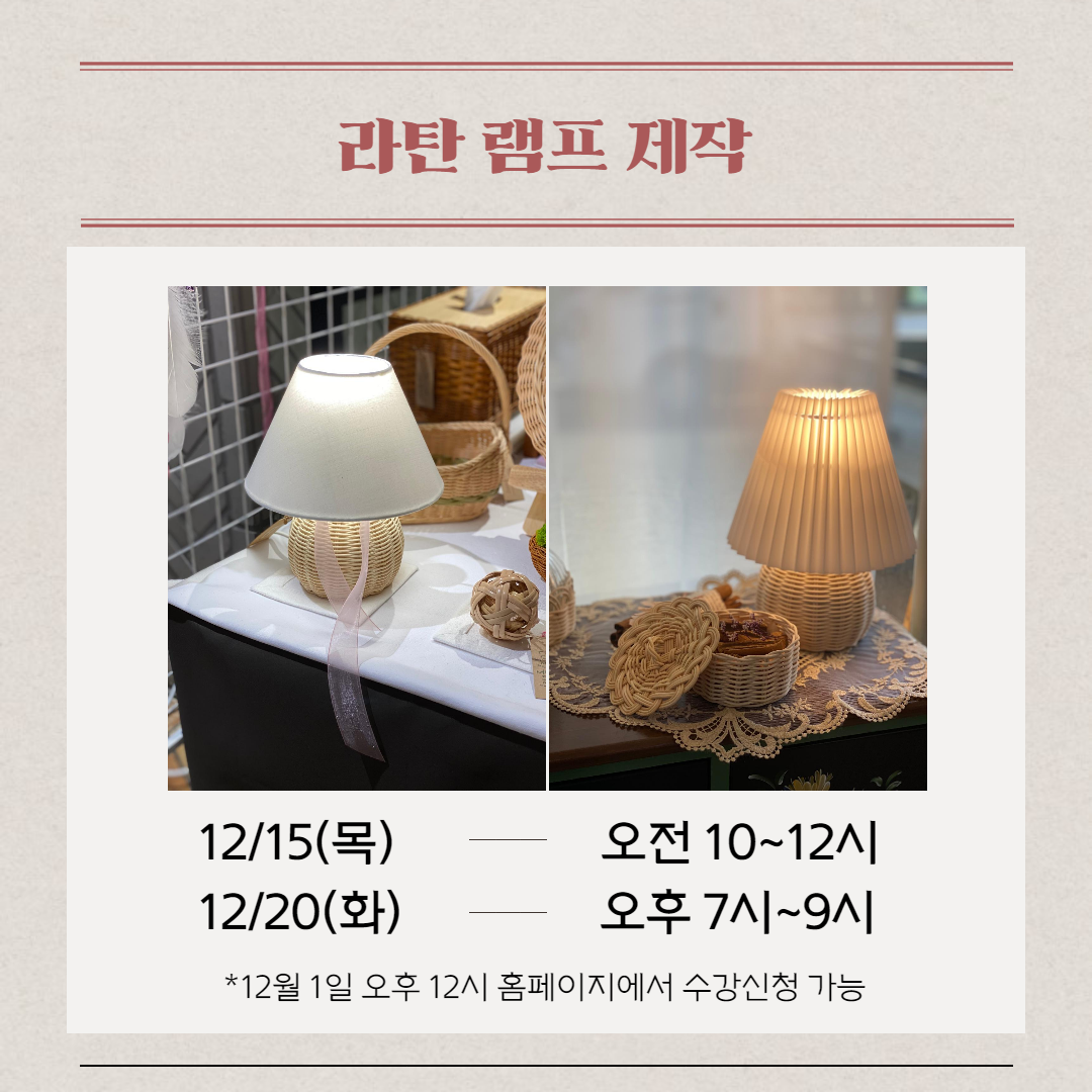 • 제목 [모집마감] [원데이클래스] 12/15(목) 오전 10시 라탄 램프 제작