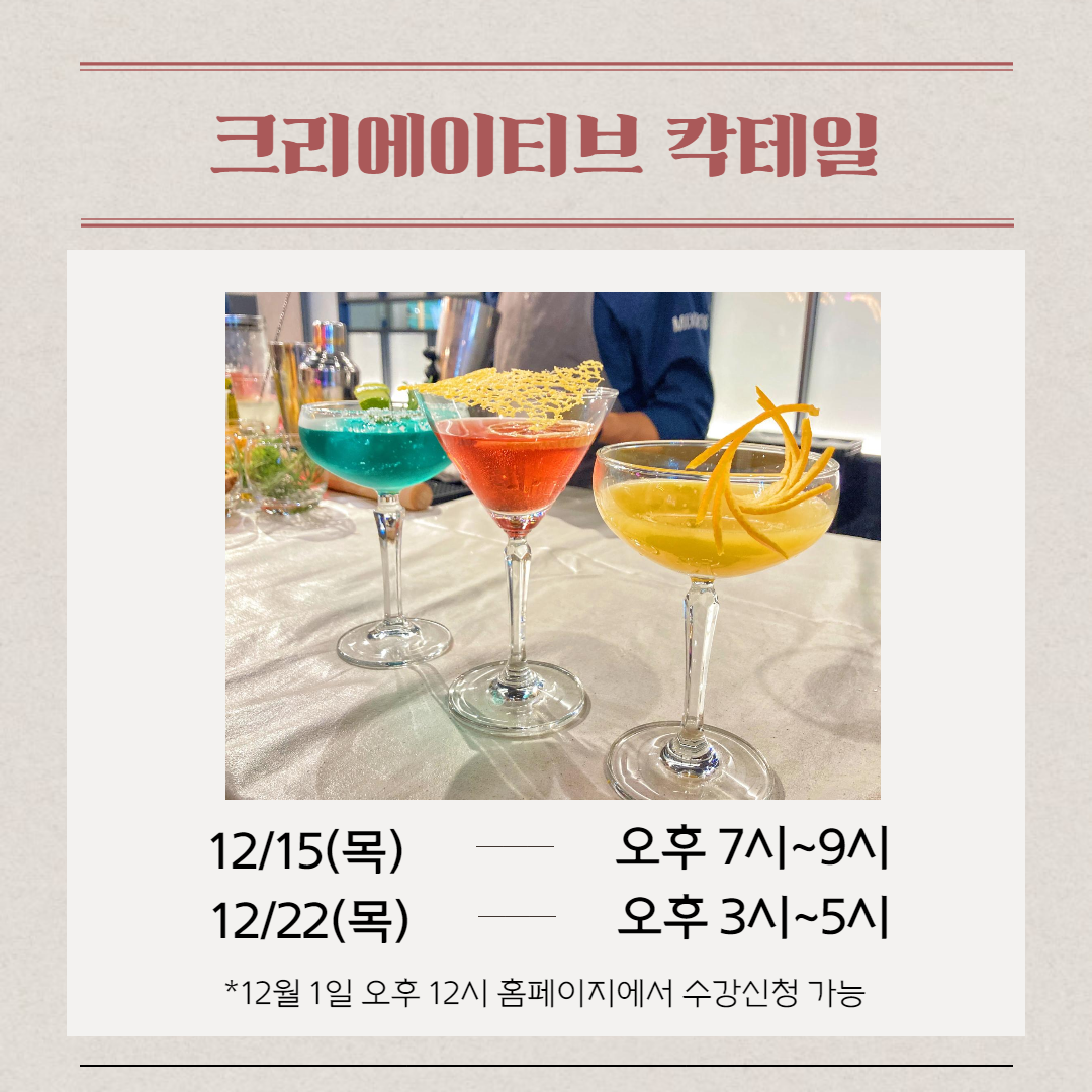 • 제목 [모집마감] [원데이클래스] 12/22(목) 오후 3시 크리에이티브 칵테일