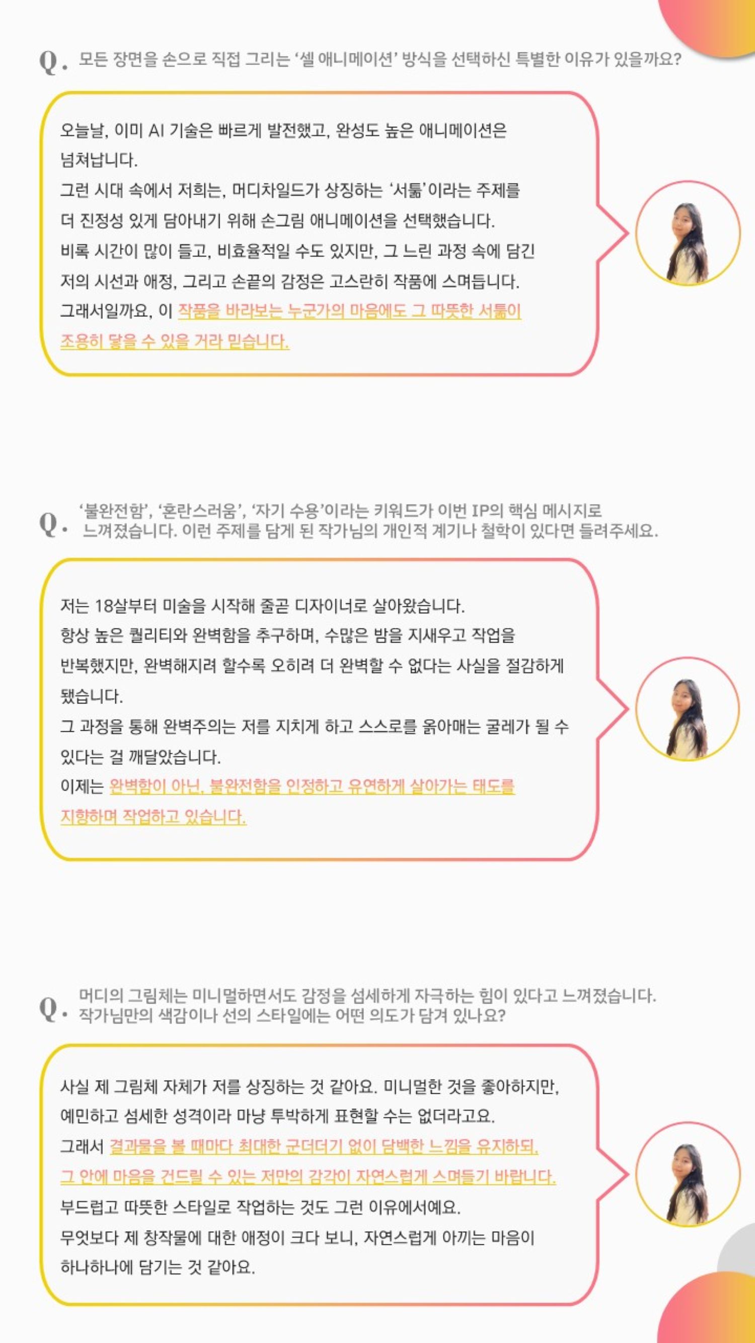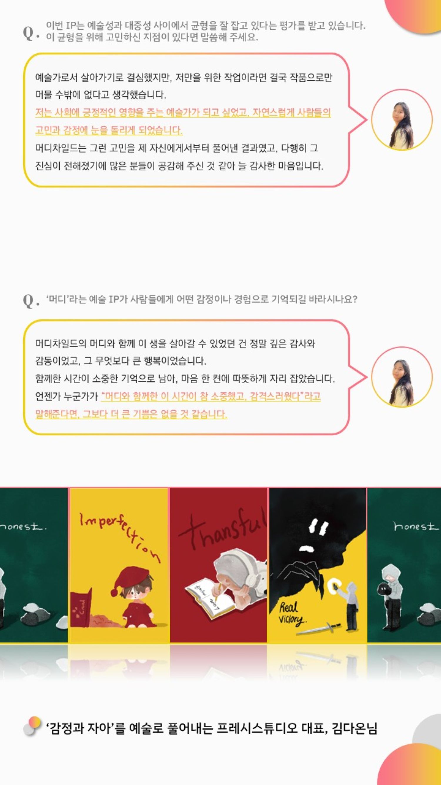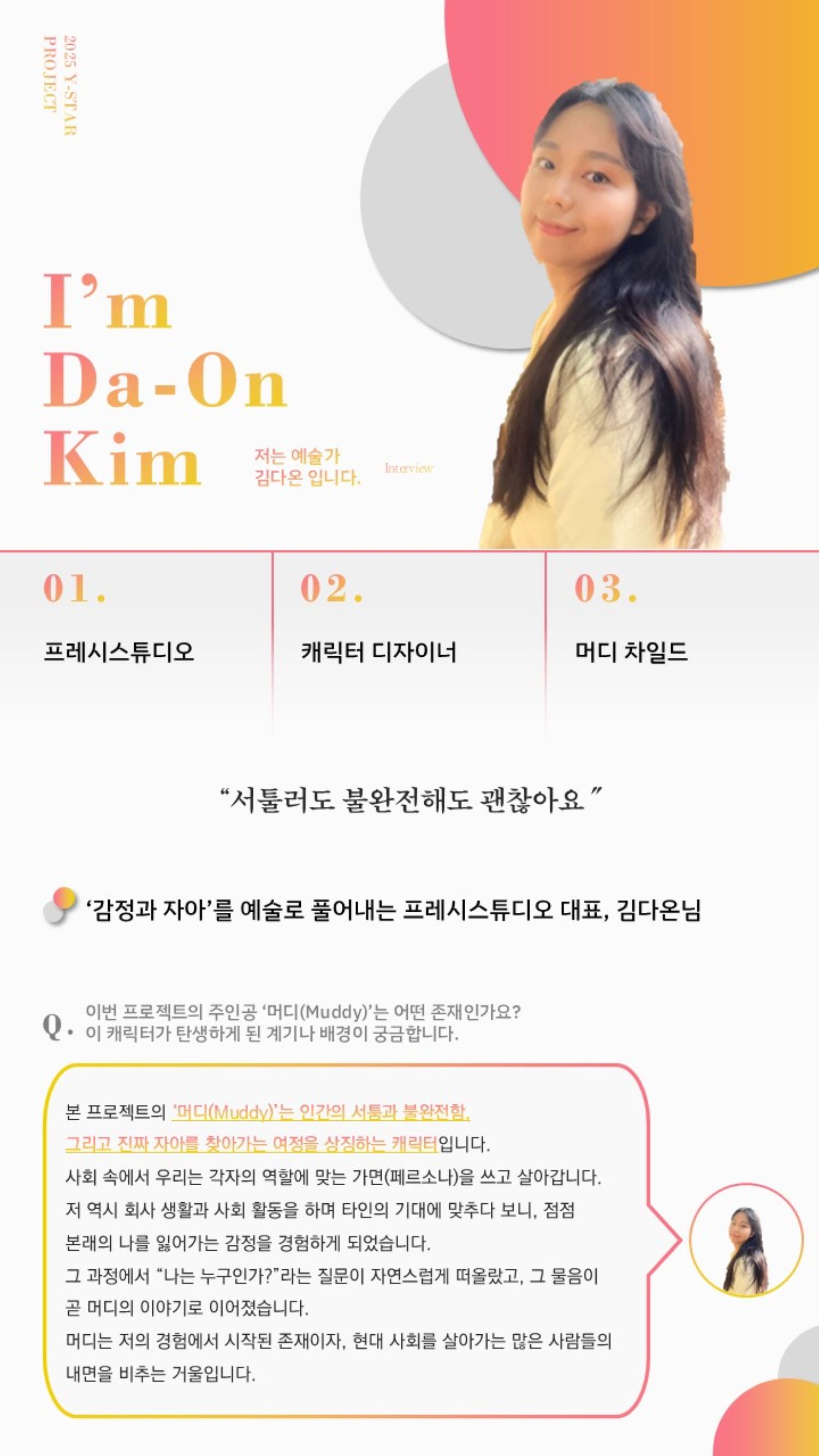 소 개 안녕하세요, 현재 캐릭터 IP를 기반으로 감정 컨텐츠 및 심리 완화 제품을 제작 기획중인 프레시스튜디오 대표 김다온 입니다.